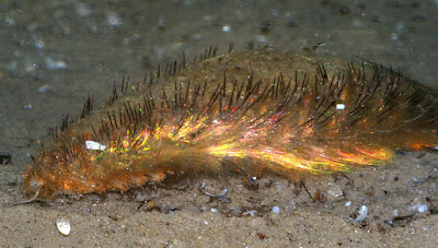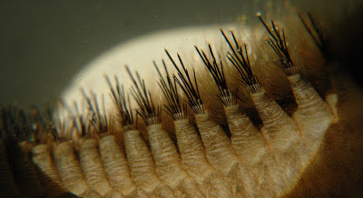 If you turn a Sea Mouse on its back you get to see the leg-type-things, or parapods, moving around in an amazingly obscene way. It's like a nightmarish centipede-bear in desperate need of a pedicure. This is how the Sea Mouse walks on the sea floor and burrows into the sand. You can also see the segmentation of the body. Indeed, there is one pair of parapods on each segment, so it IS an annelid after all!